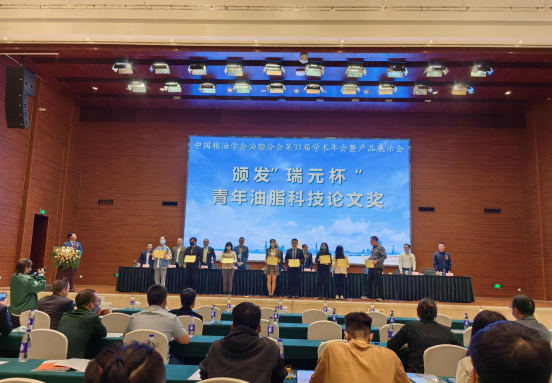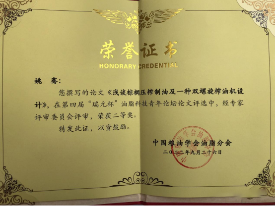 会议开幕式上,学会领导为第四届“瑞元杯”青年油脂科技论文奖的获奖代表颁奖。河南华泰粮油机械股份有限公司工艺部副部长姚骞撰写的论文《浅谈棕榈压榨制油及一种双螺旋榨油机设计》在第四届“瑞元杯”油脂科技青年论坛论文评选中,经专家评审委员会评审,荣获二等奖。