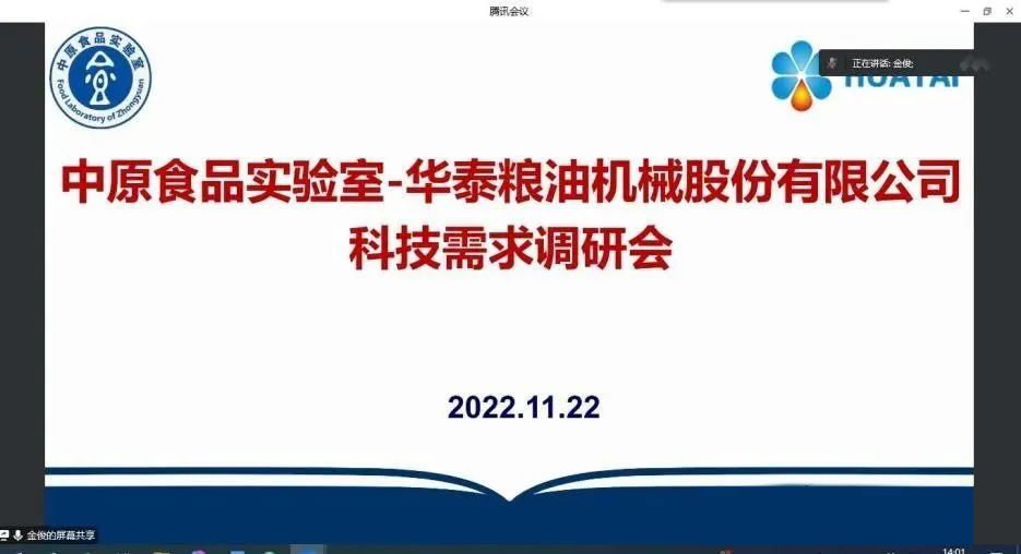 2022年11月22日,中原食品实验室-华泰粮油机械股份有限公司科技需求调研会在线上召开,中国工程院院士、中国农业大学教授、实验室主任任发政,江南大学教授、中原食品实验室油脂加工研究中心(简称“中心”)省外科学家王兴国,河南工业大学教授、“中心”省内科学家毕艳兰,滑县制造业开发区管委会主任侯德安,河南华泰粮油机械股份有限公司董事长闫子鹏和江南大学、河南工业大学、河南农科院等单位的30余位业内人士出席了调研会,会议由王兴国教授主持。