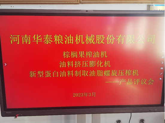 3月9日,中国粮油学会油脂分会组织由中国粮油学会油脂分会会长、武汉轻工大学教授何东平任主任委员,合肥工业大学教授姜绍通任副主任委员,中国粮油学会油脂分会副会长兼秘书长周丽凤研究员等任委员的7位专家组成专家组,在河南滑县召开由河南华泰粮油机械股份有限公司完成的“棕榈果榨油机”、“油料挤压膨化机”、“特种油料新型榨油机”产品评议会,认为产品资料齐全规范、数据翔实,符合评议要求。