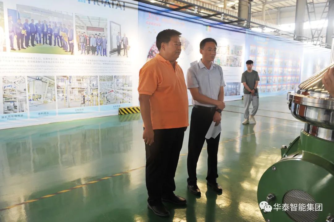 李若海一行先后参观了华泰智能装备集团的生产车间、产品展示车间。闫子鹏就集团的研发生产、市场运营、产品优势以及上市进展等情况进行了详细介绍。李若海对华泰智能装备集团在油脂机械、环保机械、医疗器械制造等方面取得的多项科学技术成果和专利技术产品,给予了高度评价,李若海指出:各有关部门要全力服务华泰上市,强化组织领导,强化政策支持,为企业提供更有速度、更有温度的上市服务,让企业发展进入新天地、实现大跨越。