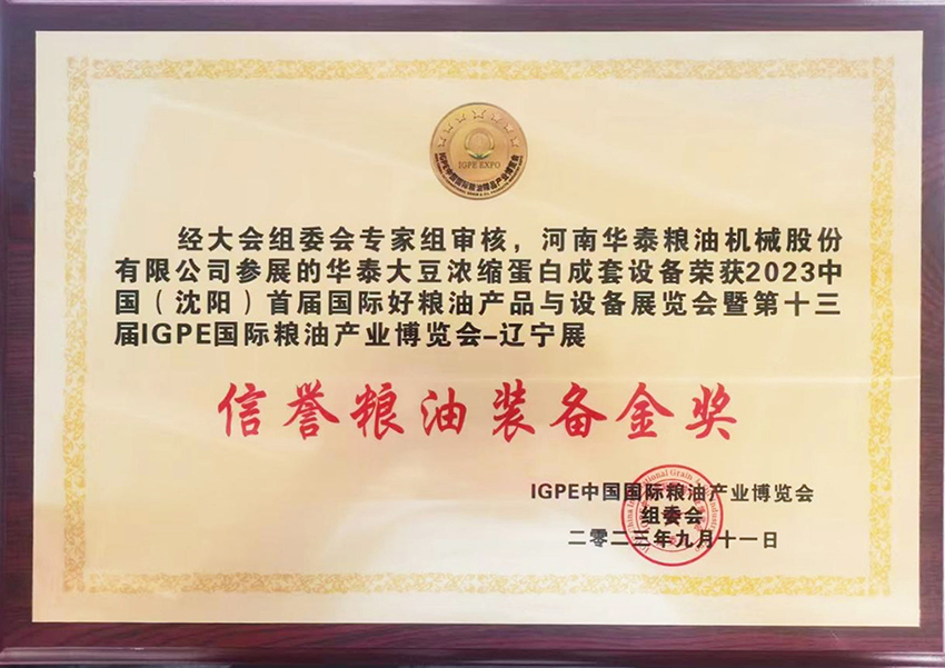 本届IGPE国际粮油产业博览会-辽宁展汇集了众多优秀粮油企业,涵盖整个东北粮食生产基地,辐射全国好粮油生产大市场。共有粮油粮机企业120余家参展,展区面积10000平方米。华泰智能装备集团的大豆浓缩蛋白成套设备荣获大会“信誉粮油装备金奖”,华泰智能装备集团销售总监王志明代表集团领取了此项殊荣。