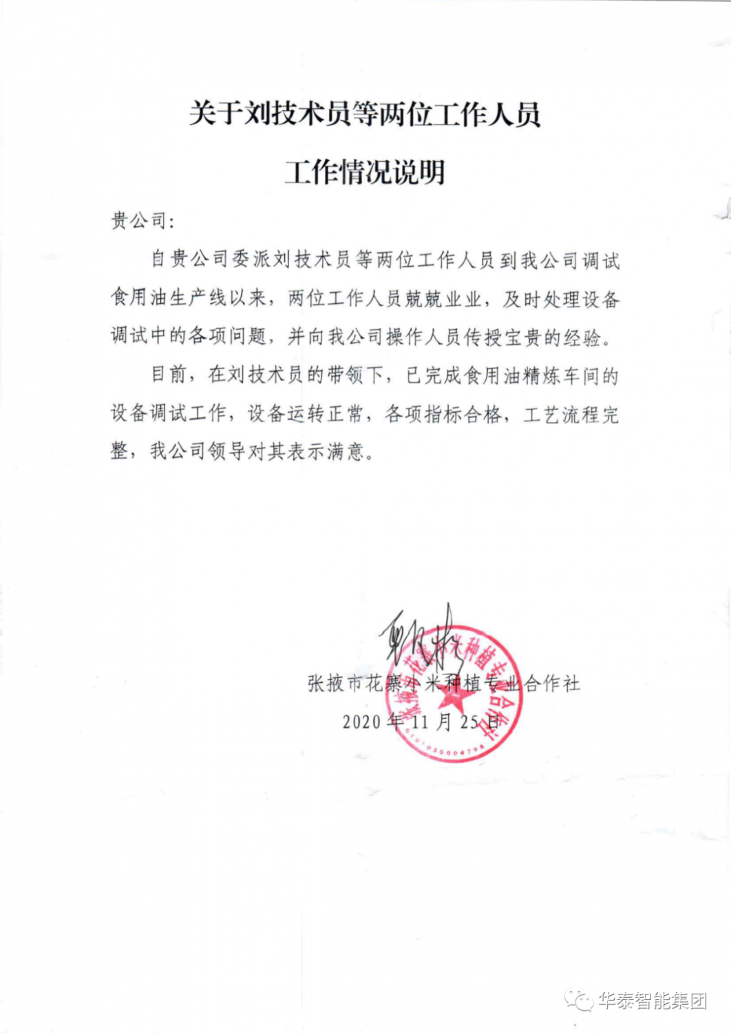 近日,由河南华泰智能装备集团旗下的河南华泰粮油机械股份有限公司设计、制造的日产25T亚麻籽榨油、10T半连续精炼项目在张掖市花寨小米种植专业合作社完成安装试营投产。