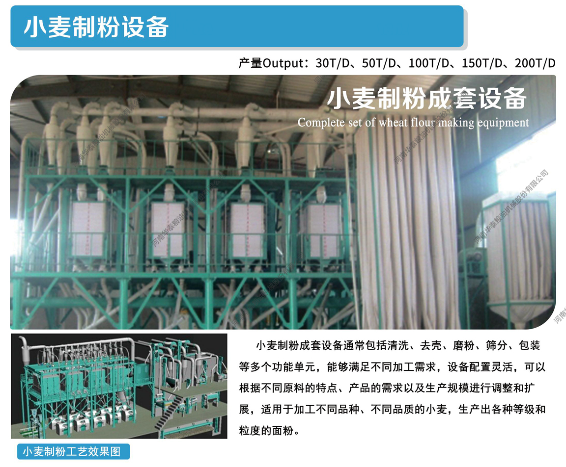 小麦制粉加工设备分单机设备和成套设备,可联产特精粉、精粉、标粉,200吨以上规格的可生产各种食品专用粉,满足食品行业的需要。该设备投资少,自动化程度高,性能稳定,能耗低,有多个品种供顾客选择。华泰制粉机设备可满足用户100-500吨每天的产量需求。