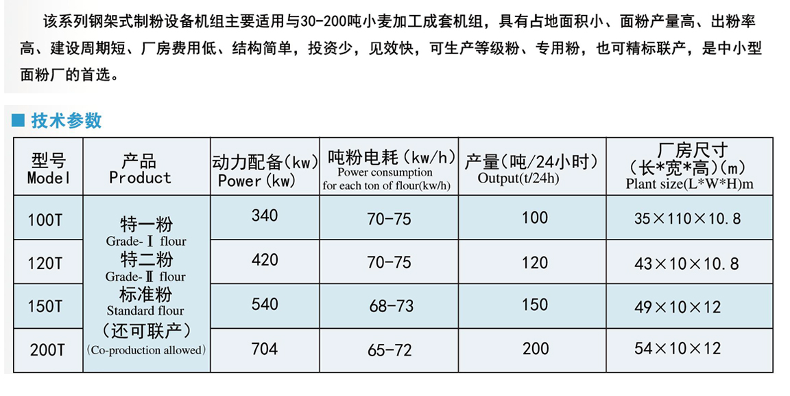 根据禁白后的市场新动向研发设计适合大中型面粉厂的以新型气动磨粉机,高方平筛、自动化控制系统组成的成套设备工程,制粉工艺成熟、组合完备、产量大、出粉率高、电耗低、操作维护方便,并且能够达到各种等级粉、专用粉生产要求,满足客户的需求。