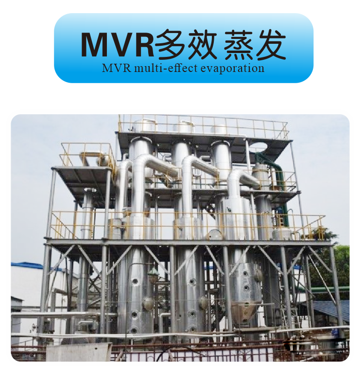 由较原始的蒸发釜,发展成单效、双效、三效、四效或者更多效蒸发器,其目的都是为了逐渐减少能源消耗。多效蒸发器是利用前一效蒸发产生的二次蒸汽为下一效提供热源,来达到节能的目的。多效可以回收部分的二次蒸汽,效数越多回收的二次蒸汽越多。这一点有别于MVR蒸发器能够回收全部的二次蒸汽。多效蒸发系统,往往考虑回收冷凝水或二次蒸汽的热量,来实现节能的目的。在废水处理中,还要考虑预热器结垢的自动在线清洗。